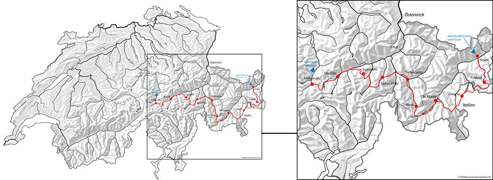 Scuol - Fuldera - Livigno - St.Moritz - Bivio - Tiefencastel - Safien Platz - Lumbrein - Disentis - Andermatt