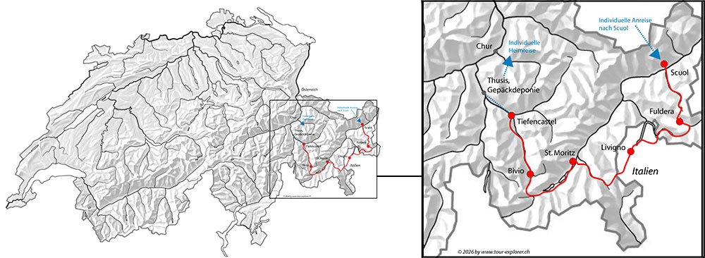 Scuol - Fuldera - Livigno - St.Moritz - Bivio - TiefencastelEs gibt wohl keine schönere Art, die Faszination der Schweiz zu erleben, als mit dem Mountain-Bike durch die Alpen zu fahren. Über unzählige Pässe, durch immer neue Täler - erleben Sie diese atemberaubende alpine Biketour Nr. 1.